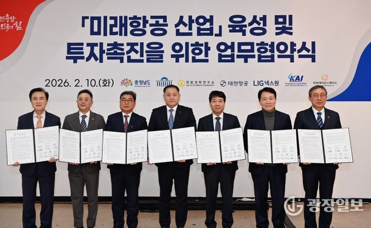 김태흠 지사는 10일 태안문화예술회관에서 성일종 국회의원, 이정석 국방과학연구소 부소장, 대한항공·LIG넥스원·한국항공우주산업(KAI)·한화에어로스페이스 등 4개 참여 기업 관계자가 참석한 가운데 미래항공 산업 육성 및 투자 촉진을 위한 업무협약을 체결했다