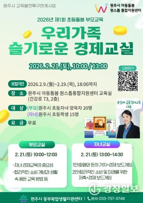 광장일보 이현나 기자 | 원주시 아동돌봄 원스톱통합지원센터는 2월 21일 초등생 가족을 위한 무료 경제 교육인'우리 가족 슬기로운 경제 교실'을 운영한다.