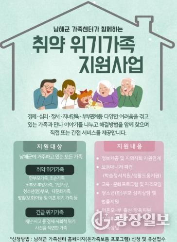 광장일보 주재영 기자 | 남해군 가족센터는 위기 상황에 처한 가정과 다양한 형태의 가족을 지원하기 위해 2026년 ‘취약·위기가족지원사업(온가족보듬사업)’을 추진한다고 밝혔다.