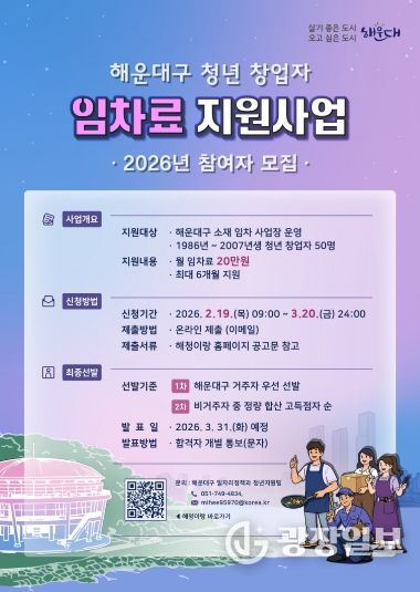 신청은 2월 19일부터 3월 20일까지 이메일을 통한 온라인 접수로 진행되며, 서류 심사를 거쳐 3월 말 최종 선정자를 발표할 예정이다. 자세한 사항은 해청이랑(해운대청년온라인플랫폼) 및 해운대구청 홈페이지에서 확인할 수 있다.