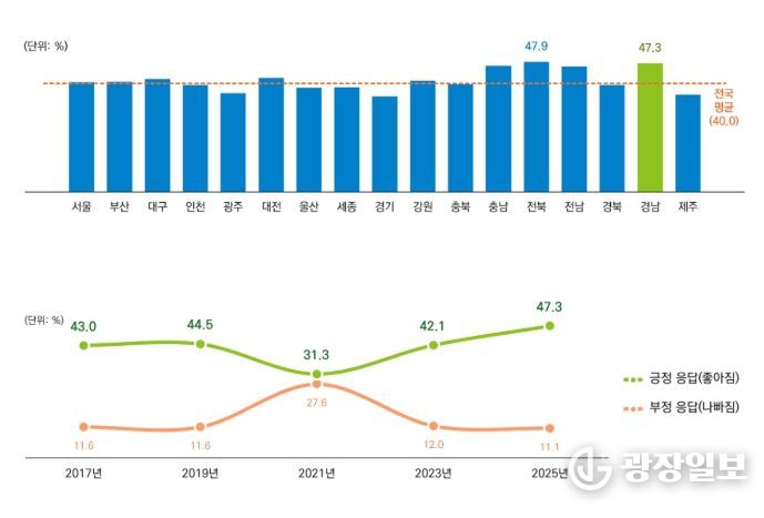 광장일보 주재영 기자 | 경남연구원은 국가데이터처 사회조사 자료를 활용해 경상남도 도민의 생활여건 변화와 정책 체감도를 종합적으로 분석한 ‘경남도민의 삶은 어떻게 달라졌나: 사회조사로 본 경상남도 생활여건 변화’ 이슈리포트를 발간했다.