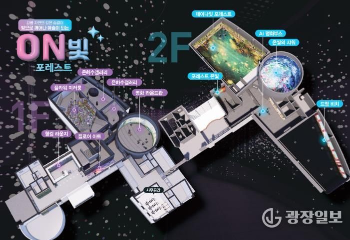 구)숲사랑홍보관을 지방소멸대응 기금 지원으로 재탄생시킨 이 공간은 빛의 숲을 테마로 한 몰입형 미디어 아트 전시 · 체험 시설이다.