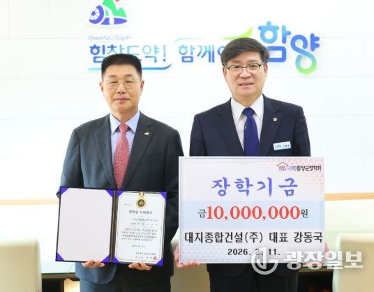 광장일보 주재영 기자 | (재)함양군장학회는 2월 11일 대지종합건설(주) 강동국 대표가 함양군 지역 학생들을 위해 장학금 1,000만 원을 기탁했다고 밝혔다.