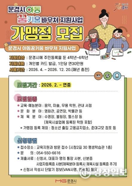 광장일보 주재영 기자 | 문경시는 지역 아동의 건강한 성장과 다양한 체험 기회 제공을 위해 추진 중인‘아동꿈키움 바우처 지원사업’과 관련해 가맹점을 모집한다.