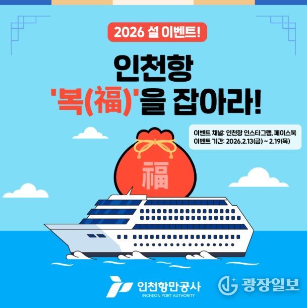광장일보 주재영 기자 | 인천항만공사는 2026년 설 명절을 맞아 공식 SNS 채널(인스타그램, 페이스북)을 활용한 참여형 이벤트 “인천항 복(福)을 잡아라”를 진행한다고 12일 밝혔다.