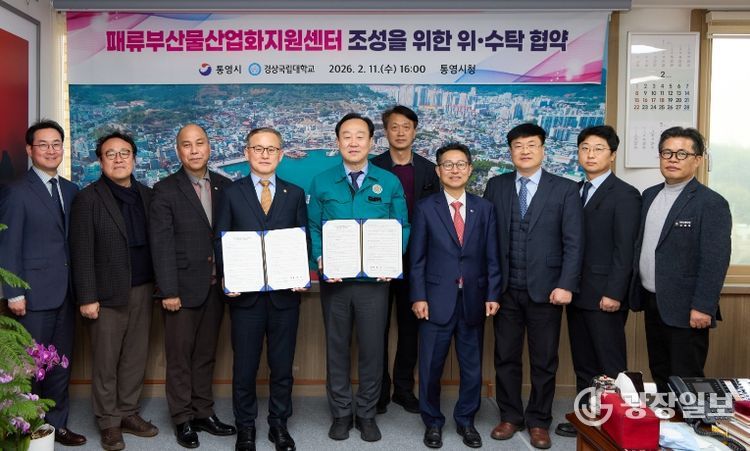광장일보 주재영 기자 | 경상국립대학교(GNU·총장 권진회)와 통영시(시장 천영기)는 2월 11일 오후 통영시 시장실에서 굴·가리비·전복 등 패류부산물을 체계적으로 처리하고 이를 고부가가치 상품으로 개발하기 위해 ‘패류부산물 산업화 지원센터’ 조성 업무협약을 체결했다.