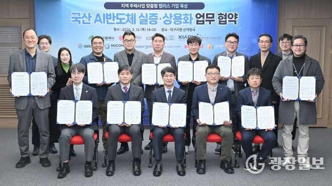 대구시는 2월 12일 시청 산격청사에서 대학, 공공기관, 팹리스 기업과 함께 ‘국산 AI 반도체의 실증 및 상용화 협력을 위한 업무협약’을 체결했다.