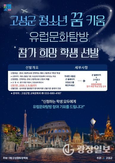 광장일보 이현나 기자 | 평화 경제 거점 도시 강원 고성군의 (재)고성향토장학회는 관내 청소년들에게 국제적 시야를 넓히고 진로 탐색의 기회를 제공하기 위해 '2026년 청소년 꿈 키움 유럽문화탐방' 참가 희망 학생을 선발한다.