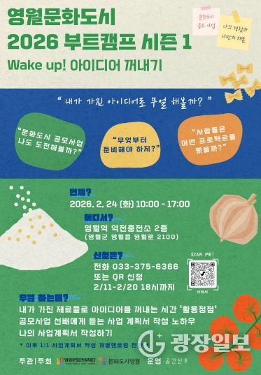 광장일보 이현나 기자 | (재)영월문화관광재단 문화도시센터는 오는 2월 24일 영월역 문화충전소에서 지역민의 창의적인 로컬 아이디어를 발굴하고 실질적인 사업계획서로 발전시키기 위한 ‘영월 로컬 아이디어 구체화 부트캠프 시즌 1’을 개최한다.