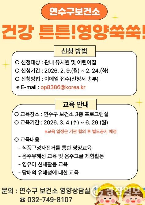 광장일보 주재영 기자 | 연수구보건소는 오는 3월부터 지역 내 어린이집과 유치원 원아를 대상으로 올바른 식습관 형성과 건강한 생활 습관 정착을 위해 2026년 ‘건강 튼튼! 영양 쑥쑥! 어린이 교실’을 운영한다.