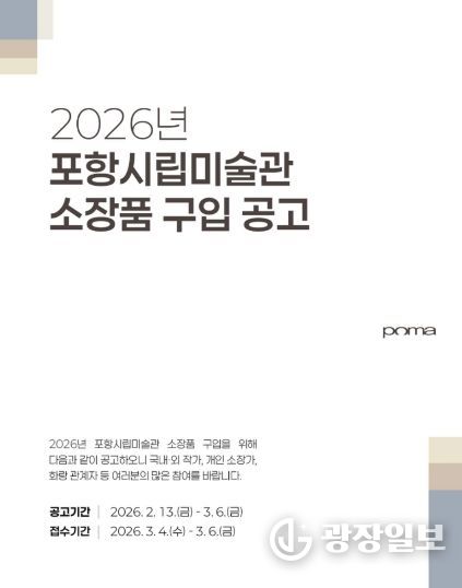 광장일보 주재영 기자 | 포항시립미술관은 13일부터 내달 6일까지 ‘2026년 포항시립미술관 소장품 구입 공고’를 진행한다.