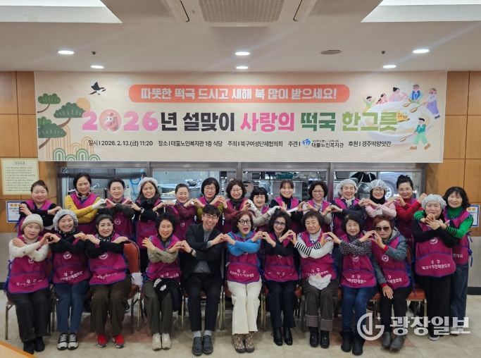 광장일보 주재영 기자 | 대구 북구여성단체협의회(회장 한성희)는 2월 13일 복현동 대불노인복지관에서 ‘2026년 설맞이 사랑의 떡국 한 그릇 나눔 행사’를 개최하여 관내 어르신 600여 명을 대상으로 따뜻한 나눔의 정을 전달했다.