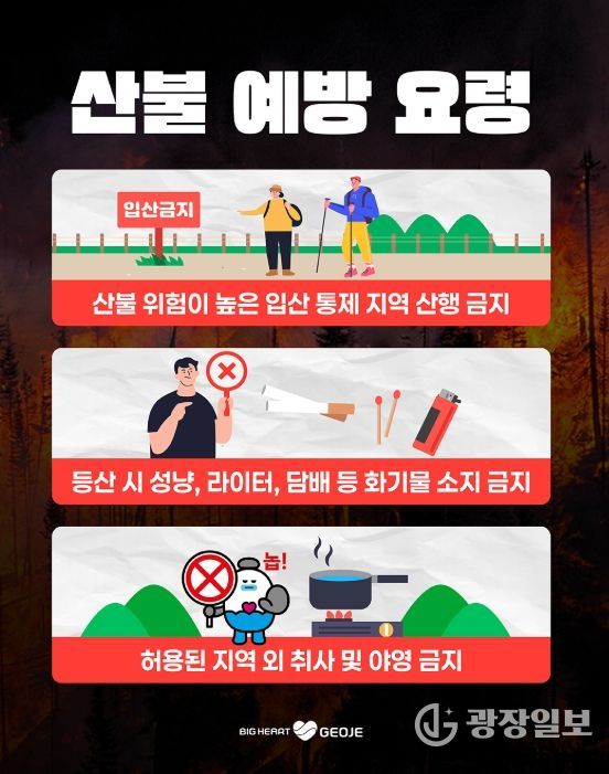 최경호 거제시 산림과장은 “설 연휴 기간은 산불 발생 위험이 매우 높은 시기인 만큼 시민 여러분께서도 산림 인접지역 소각 금지 등 산불 예방 수칙을 반드시 준수해 주시기를 당부드린다”며 “거제시는 산불 예방과 신속 대응을 위해 행정력을 집중하겠다”고 말했다.