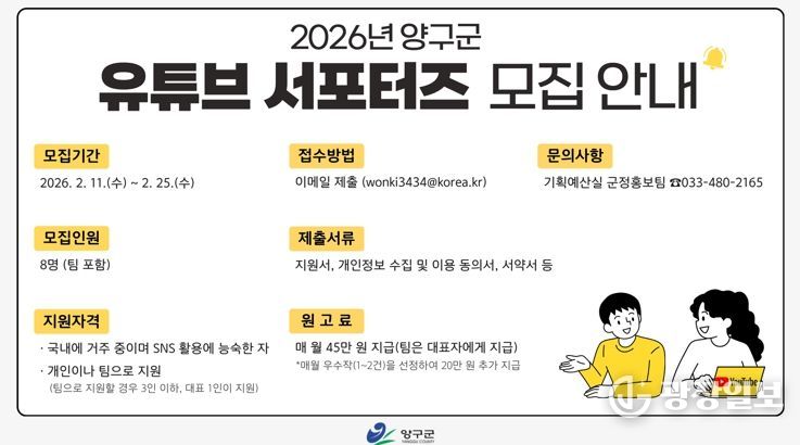 광장일보 이현나 기자 | 양구군이 오는 25일까지 지역의 매력을 영상으로 생생하게 전달할 유튜브 서포터즈를 모집한다.