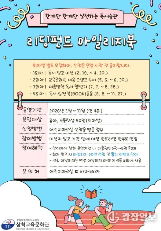 광장일보 이현나 기자 | 삼척교육문화관은 관내 유아·초등학생을 대상으로 2월부터 11월까지 어린이 독서 실천 프로그램 ‘리딩펀드 마일리지북’을 운영한다.