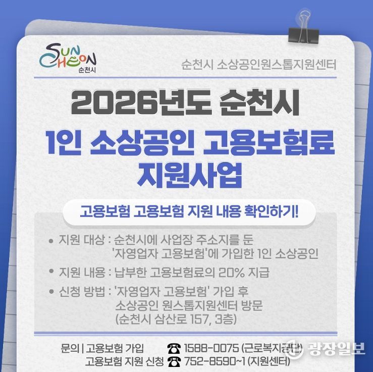 광장일보 주재영 기자 | 순천시는 지역 내 1인 소상공인의 경영안정과 사회안전망 강화를 위해 ‘2026년 1인 소상공인 고용보험료 지원사업’을 19일부터 본격 시행한다고 밝혔다.