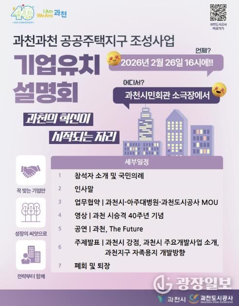 광장일보 주재영 기자 | 과천시와 과천도시공사는 오는 2월 26일 오후 4시 과천시민회관 소극장에서 ‘과천과천 공공주택지구 기업유치 설명회’를 개최한다고 밝혔다.