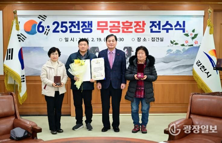 광장일보 주재영 기자 | 김천시는 2월 19일 김천시청 접견실에서 6·25전쟁 중 국가와 나라를 위해 헌신하고 돌아가신 무공수훈자의 유족에게 무공훈장을 전수하는 전수식을 개최했다.