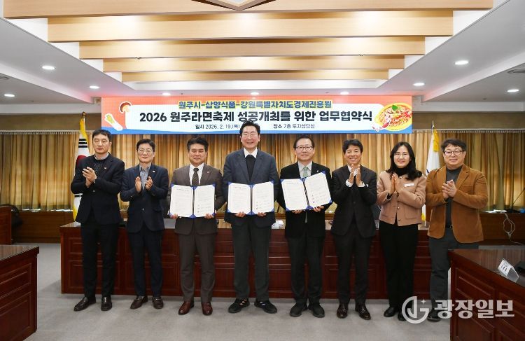 광장일보 이현나 기자 | 원주시는 ‘2026 원주라면축제’의 성공적인 개최를 위해 19일 오후 2시, 시청 7층 투자상담실에서 삼양식품, 강원특별자치도경제진흥원과 업무협약을 체결했다.