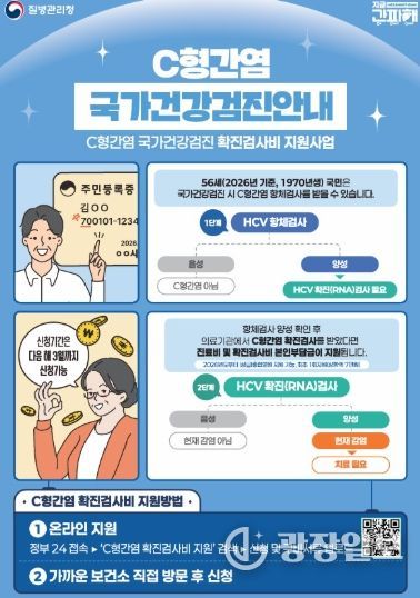 질병관리청은 2026년부터 56세(1970년생)를 대상으로 국가건강검진에서 C형간염 항체 양성 판정을 받은 경우, 확진 검사비 지원 의료기관을 기존 병·의원급에서 상급·종합병원까지 포함한 모든 의료기관으로 확대한다. 지원 항목은 진찰료와 검사비 본인부담금이다. 1회 최대 7만 원을 지원한다.