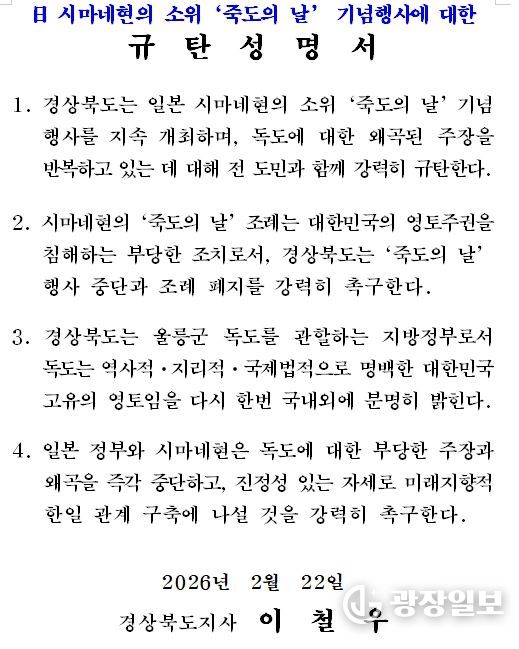 광장일보 주재영 기자 | 경상북도는 22일, 일본 시마네현이 소위 ‘죽도의 날’ 행사 개최에 대해 강력히 규탄하며, 행사 즉각 중단과 관련 조례 폐지를 촉구했다.