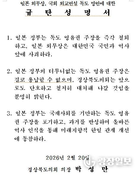 광장일보 주재영 기자 | 경상북도의회는 20일, 모테기 도시미쓰 일본 외무상이 일본 국회에서 독도 영유권을 주장하는 망언을 한 데 대해 강력히 항의하며, 독도는 대한민국의 고유 영토임을 재차 천명하는 성명서를 발표했다.