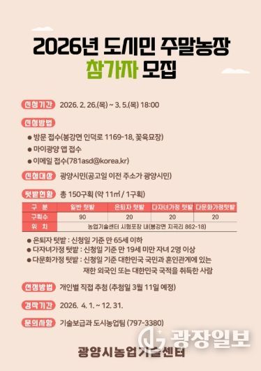 광장일보 주재영 기자 | 광양시는 도심 속에서 농업을 체험하며 가족과 함께 건강한 여가를 보낼 수 있는 ‘2026년 도시민 주말농장’ 참가자를 2월 26일부터 3월 5일까지 모집한다고 밝혔다.