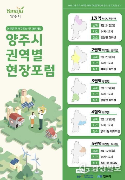 광장일보 주재영 기자 | 양주시가 오는 24일부터 3월 17일까지 5차례에 걸쳐 ‘농촌공간 재구조화 및 재생 기본계획’ 수립을 위한 권역별 주민현장포럼을 개최할 예정이다.
