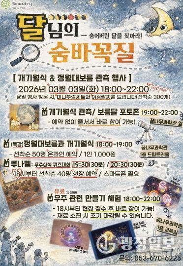 광장일보 주재영 기자 | 국립대구과학관은 개기월식과 정월대보름을 기념해 3월 3일 ‘개기월식·정월대보름 관측행사: 달님의 숨바꼭질’을 개최한다.