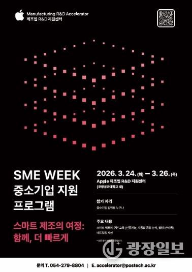 광장일보 주재영 기자 | 포항시와 애플 제조업 R·D 지원센터(포항공과대학교 내)는 지역 제조업의 디지털 혁신을 가속화하고 중소기업의 스마트 제조 역량 강화를 위해 내달 24일부터 26일까지 3일간 ‘SME Week 중소기업 지원 프로그램’을 개최한다.