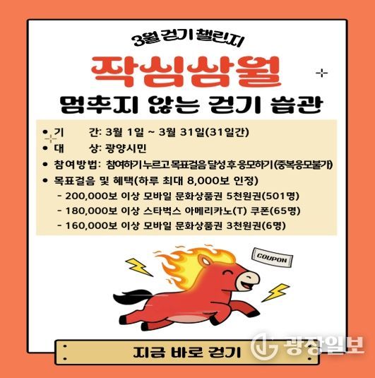 광장일보 주재영 기자 | 광양시는 오는 3월 1일부터 3월 31일까지 한 달간 모바일 걷기 앱 워크온을 활용한 ‘작심삼월, 멈추지 않는 걷기 습관! 3월 걷기 챌린지’를 운영한다고 24일 밝혔다.