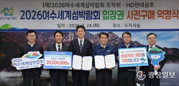 광장일보 주재영 기자 | (재)2026여수세계섬박람회조직위원회는 2월 24일 전라남도청 도지사실에서 HD현대삼호와 ‘2026여수세계섬박람회 입장권 구매약정식’을 개최했다고 밝혔다.