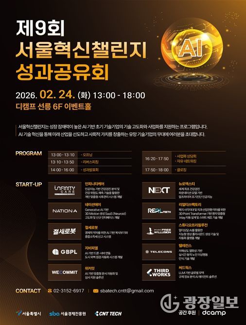 이러한 정책 방향 속에서 시는 24일, 선릉 디캠프에서 ‘제9회 서울혁신챌린지 성과공유회’를 개최했다. 이번 행사는 참여 기업들의 기술 고도화 성과를 공유하고, 투자자와의 1:1 매칭 상담을 통해 본격적인 사업화·투자 연계를 추진하는 ‘기술사업화의 장’으로 운영됐다.