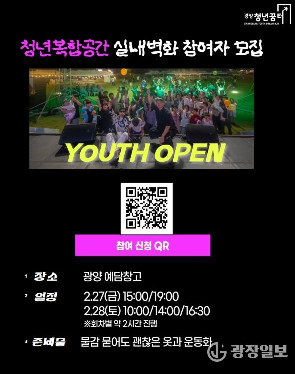 한편, 청년복합공간 실내벽화 프로젝트 참여자 모집과 관련된 자세한 사항은 광양청년꿈터 누리집 또는 전화 문의를 통해 확인할 수 있다.