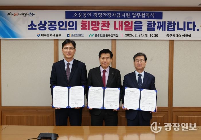 광장일보 주재영 기자 | 대구신용보증재단이 2월 24일 중구청 상황실에서 중구청, iM뱅크 중구청지점과 소상공인 경영안정 지원을 위한 업무협약을 체결했다.