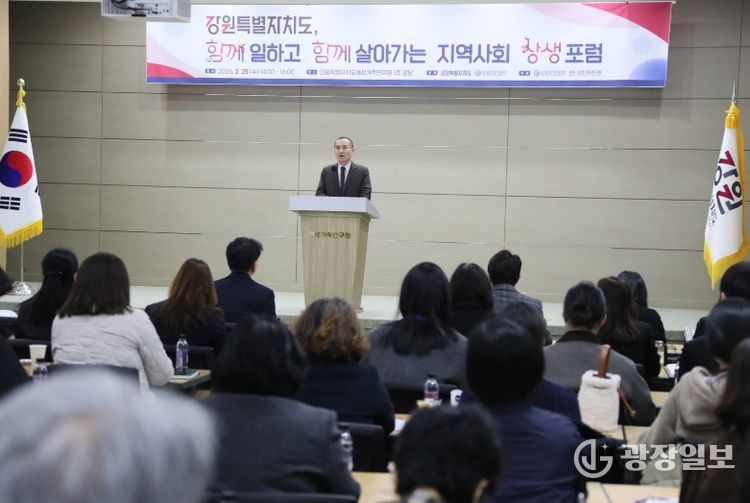 광장일보 이현나 기자 | 강원특별자치도는 2월 25일 강원특별자치도여성가족연구원 1층 강당에서 강원특별자치도와 강원도민일보가 공동 주최하고, 강원특별자치도여성가족연구원과 강원도민일보가 주관하는 '강원특별자치도, 함께 일하고 함께 살아가는 지역사회 상생포럼'을 개최했다.