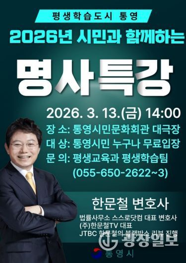 이번 강연은 '평생학습도시 통영, 2026년 시민과 함께하는 명사초청 강연'의 첫 번째 순서로 마련됐으며, 교통사고 전문 변호사로 널리 알려진 한문철 변호사가 강연자로 나선다.