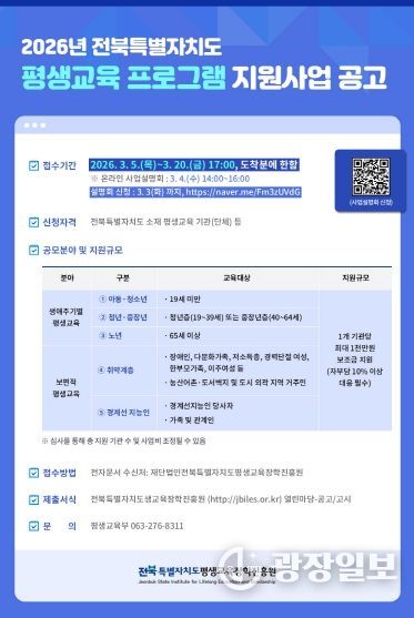 광장일보 주재영 기자 | 전북특별자치도평생교육장학진흥원(원장 이현웅)은 도민의 지속적인 성장과 삶의 질 향상을 위해 '2026년 전북특별자치도 평생교육 프로그램 지원사업'공모를 실시하고, 참여할 도내 평생교육 기관·단체를 모집한다.