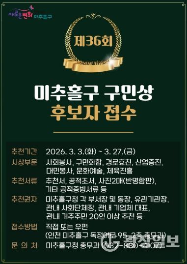 추천 서류는 미추홀구청 총무과로 직접 방문하거나 우편(미추홀구 독정이로 95, 미추홀구청 총무과)을 통해 접수할 수 있으며, 수상자는 미추홀구 구민상심의위원회의 심의를 거쳐 최종 결정된다. 시상은 5월 1일 제36회 구민의 날 기념식에서 진행될 예정이다.