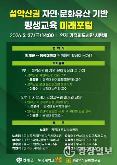 한편, 협약식과 함께 2025년 인제군–동국대 협력사업의 일환으로 '설악산권 자연·문화유산 기반 평생교육 미래포럼'이 개최된다.