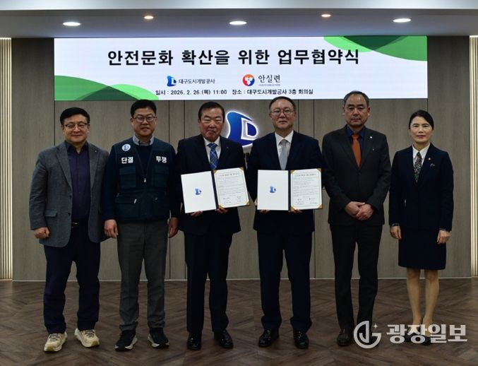 광장일보 주재영 기자 | 대구도시개발공사는 2월 26일 본사 회의실에서 (사)대구안전생활실천시민연합과 ‘안전문화 확산을 위한 업무협약’을 체결했다.