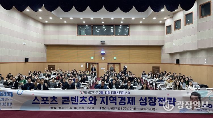 광장일보 이현나 기자 | 강원특별자치도는 2월 26일 강원대학교 60주년기념관 국제회의실에서 '스포츠 콘텐츠와 지역경제 성장 전략'을 주제로 2월 강원경제스터디를 개최했다.