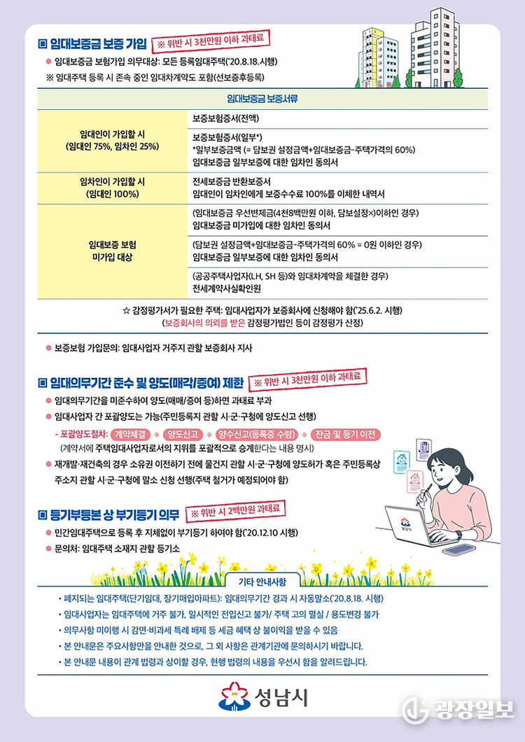 성남시= 주재영 기자 | 성남시(시장 신상진)가 잦은 법령 개정과 제도 변화로 혼란을 겪는 지역 임대사업자를 지원하기 위해 ‘등록 임대사업자 주요 준수사항’ 안내문을 제작해 발송한다.