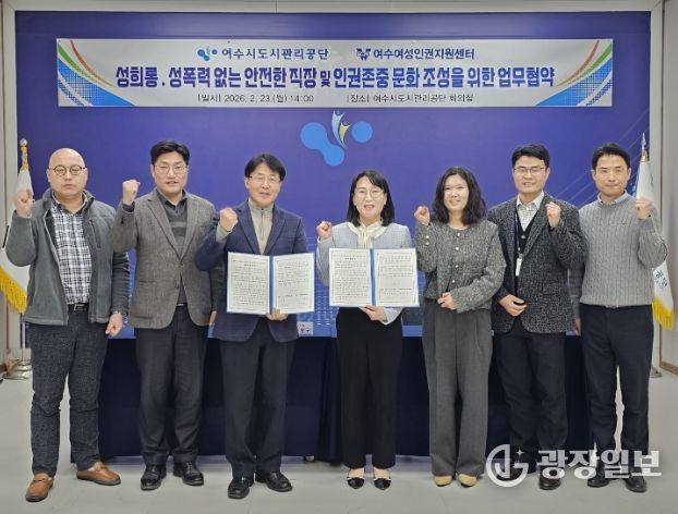 광장일보 주재영 기자 | 여수시도시관리공단은 성평등한 조직문화 정착과 인권친화적 공공시설 조성을 위해 여수여성인권지원센터(센터장 윤은미), 여수시 여성친화도시 시민참여단 위하다WE_하다(단장 이현영)와 잇달아 업무협약을 체결했다고 27일 밝혔다.