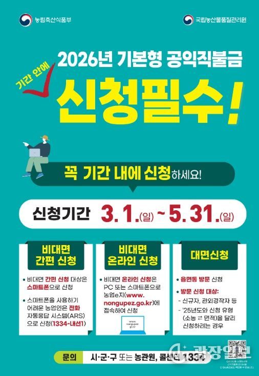 광장일보 주재영 기자 | 광양시는 농업·농촌의 공익기능을 증진하고 농업인의 소득 안정을 도모하기 위해 3월 1일부터 5월 31일까지 ‘2026년 기본형 공익직불제’ 접수를 실시한다.