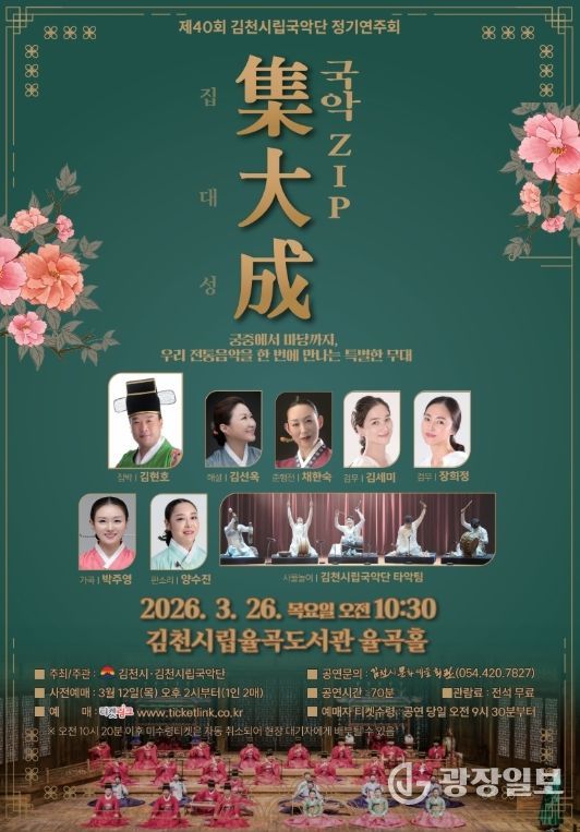 광장일보 주재영 기자 | 김천시문화예술회관은 3월 26일 목요일 오전 10시 30분에 시립율곡도서관 율곡홀에서 시립국악단 제40회 정기연주회를 개최한다.
