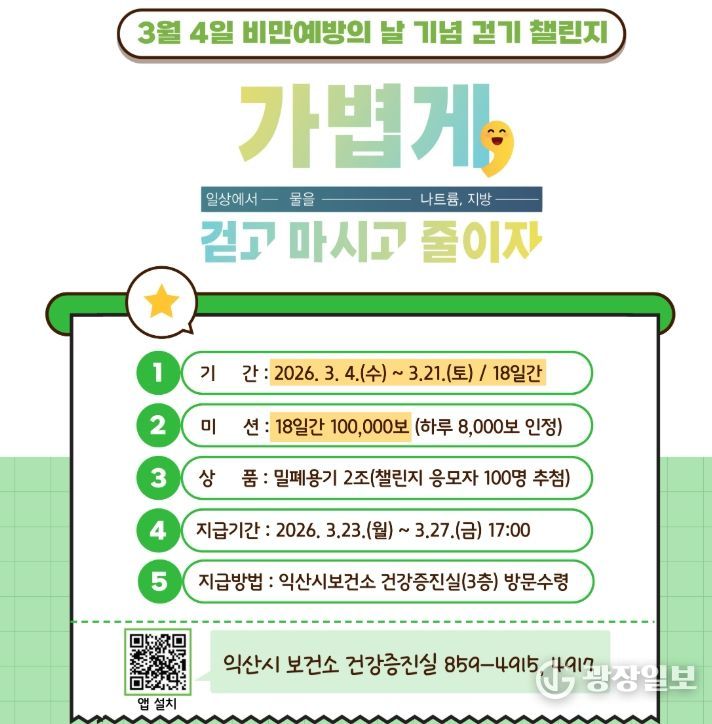 광장일보 주재영 기자 | 익산시가 3월 4일 비만예방의 날을 맞아 시민들의 건강한 생활습관 형성을 위한 '10만 보 걷기 챌린지'를 운영한다.
