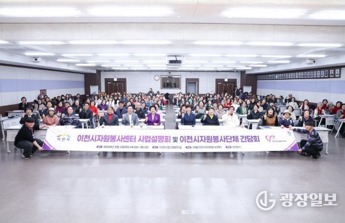 광장일보 주재영 기자 | 이천시자원봉사센터는 3월 3일 시청 대회의실에서 김경희 이천시장, 박명서 이천시의회 의장을 비롯한 자원봉사자 180여 명이 참석한 가운데 ‘2026년도 사업설명회 및 자원봉사단체 간담회’를 개최했다.