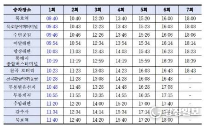 이에 따라 3월 7일부터는 묵호역 기준 오전 9시 40분에 1회차 운행이 시작되며, 수변공원, 망상해변, 무릉별유천지 등 주요 거점 정류장의 도착 시간도 10분씩 빨라진다.