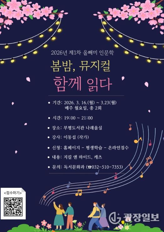 광장일보 주재영 기자 | 인천광역시교육청부평도서관은 5일부터 2026년 제1차 올빼미 인문학 강연 ‘봄밤, 뮤지컬 함께 읽다’ 참여자를 모집한다.